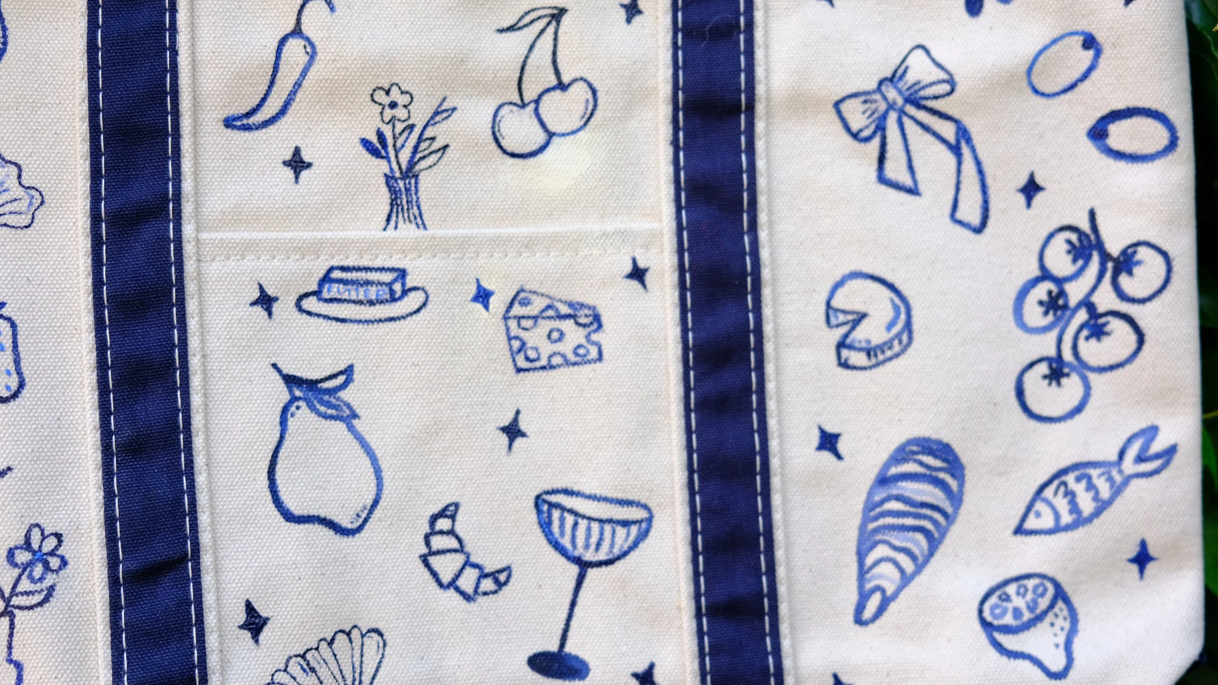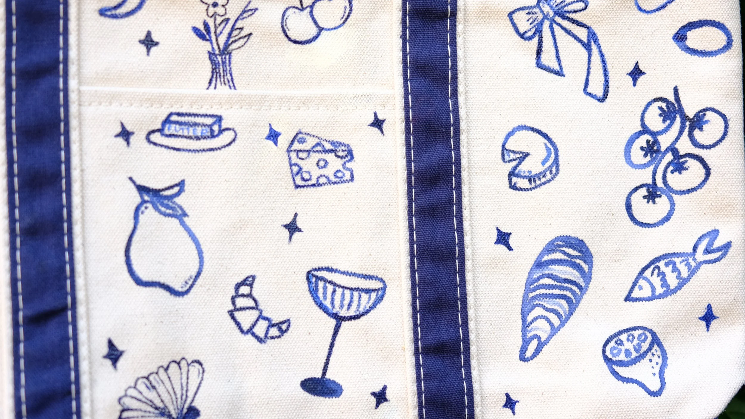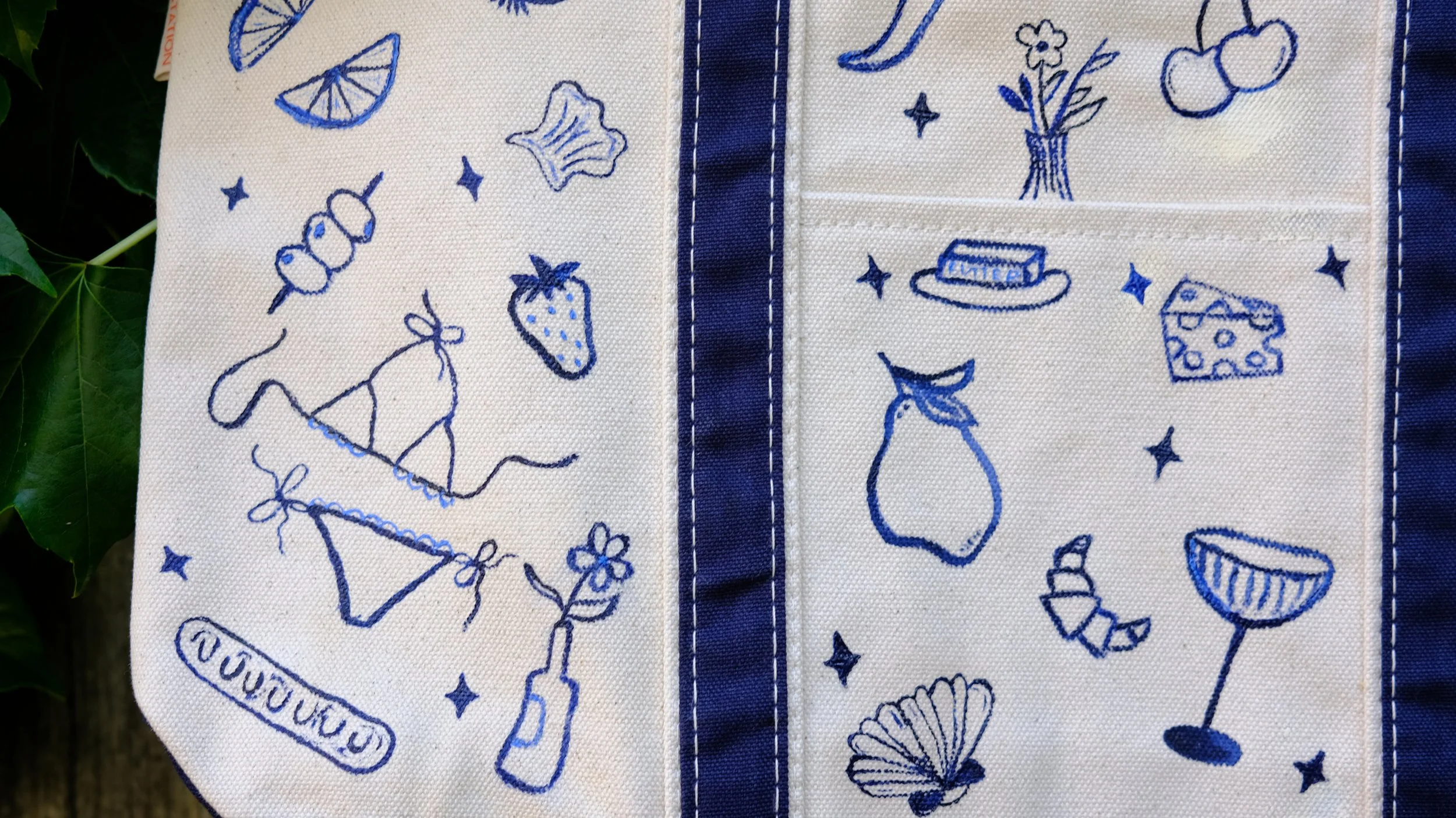 Elevate your style with this one-of-a-kind, navy-on-cream canvas tote, adorned with a distinctive hand-painted design. Perfect for art lovers and fashion-forward individuals alike.